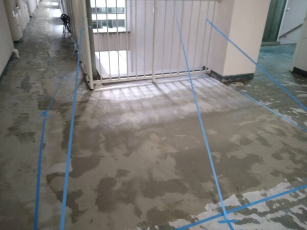 今回は某団地にて、廊下床の長尺シートを撤去した後の下地補修工事をいたしました。